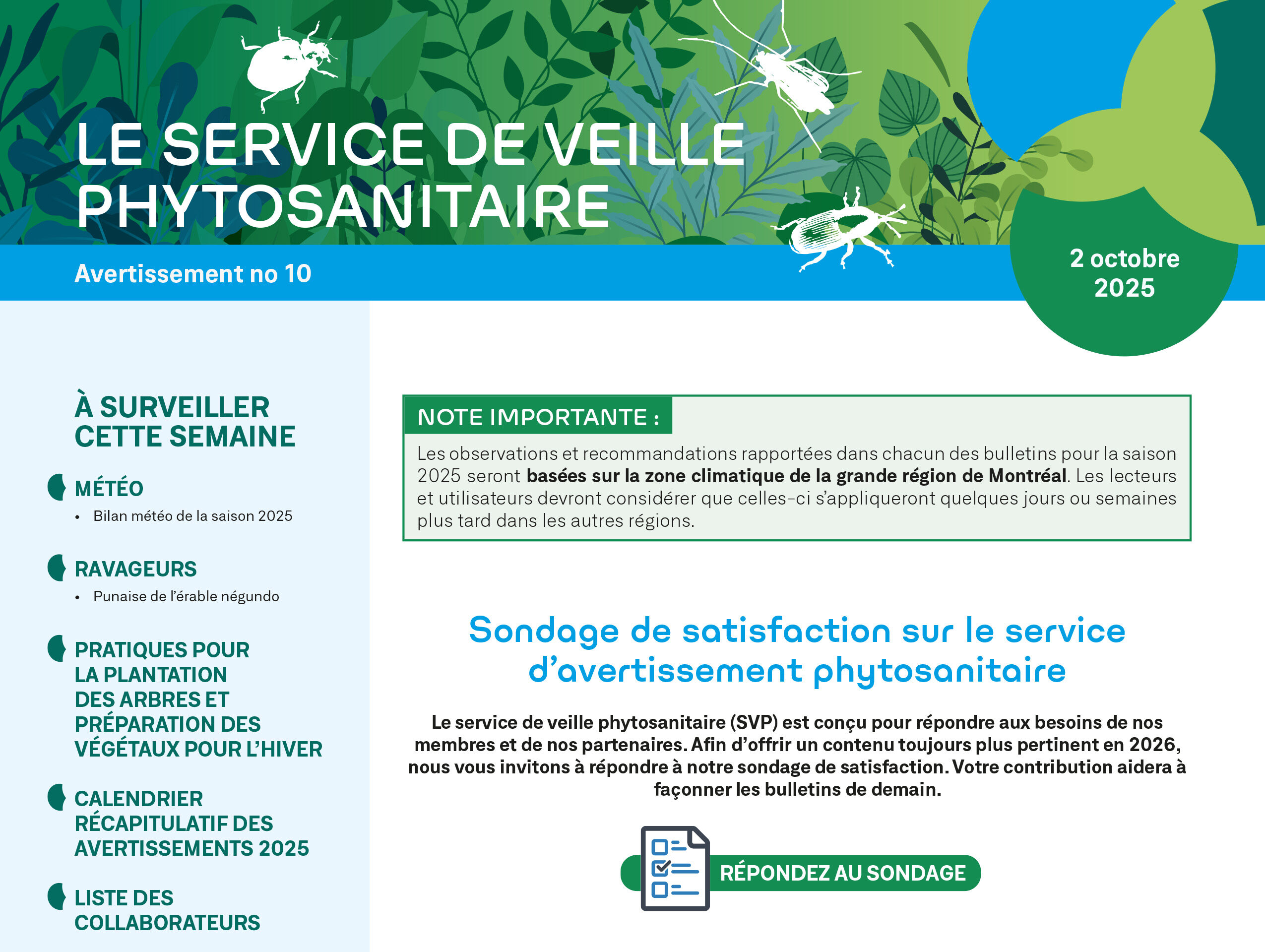 • En haute saison, vous recevrez les incontournables bulletins de veille phytosanitaire qui divulguent les maladies et ravageurs présents sur le territoire. Québec Vert réalise, coordonne et diffuse des bulletins dans le cadre du Service de veille phytosanitaire (SVP) en collaboration avec l’ASHOQ et Les Fleurons du Québec. Le SVP a pour objectif principal d’identifier les insectes ravageurs et les maladies présents sur le territoire québécois. Il offre également des éléments de diagnostic, des solutions d’intervention et des options de traitement pour soutenir les professionnels du secteur horticole dans leurs pratiques. Le bulletin s’adresse notamment aux jardineries, aux entreprises d’entretien d’espaces verts et aux municipalités, afin de les aider à transmettre, au bon moment dans la saison, des recommandations claires et appropriées à leurs clientèles et aux citoyens. Le SVP est diffusé en exclusivité aux membres Entreprise et Partenaire de Québec Vert, ainsi qu’aux membres de l’Association des services en horticulture ornementale du Québec (ASHOQ) et aux municipalités certifiées Fleurons du Québec.