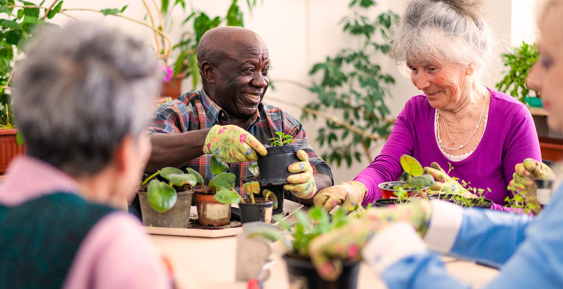 Atelier d’horticulture thérapeutique : des aînés cultivant le bien-être ensemble, en alliant jardinage et convivialité dans un cadre stimulant