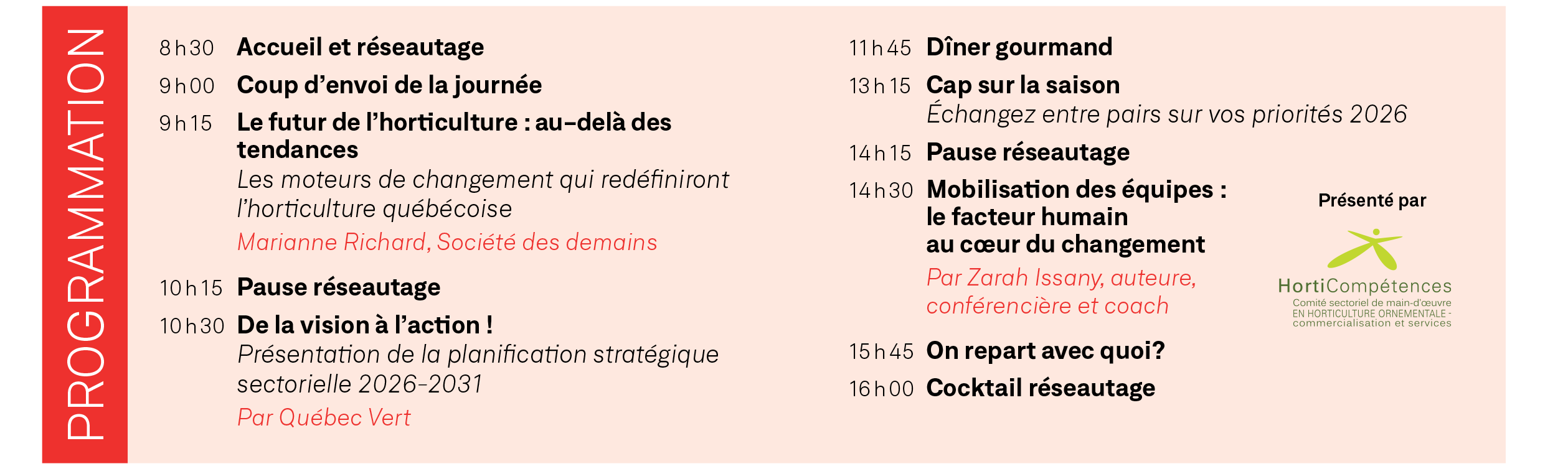 Plongez au cœur des moteurs de changement qui redéfiniront l’horticulture québécoise avec la conférence « Le futur de l’horticulture : au-delà des tendances », suivie de la présentation de la planification stratégique sectorielle 2026–2031 « De la vision à l’action! ». Place ensuite à l’atelier « Cap sur la saison » qui vous permettra d’échanger et de clarifier vos priorités pour 2026, avant de conclure la journée avec la conférence « Mobilisation des équipes : le facteur humain au cœur du changement », animée par Zarah Issany.